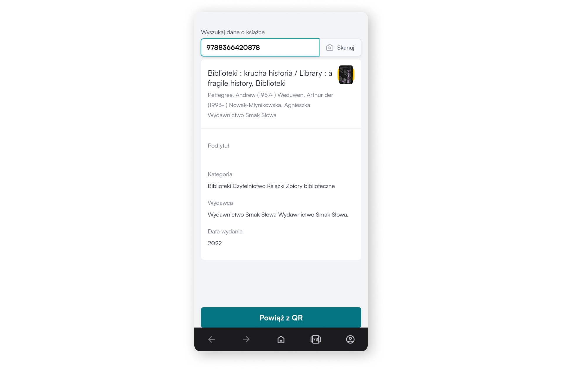 Do skatalogowania książki, poza etykietą z kodem QR, potrzeba nam będzie smartfon z kamerą. Musimy bowiem zeskanować kod QR, aby otworzyć zawarty w nim link.