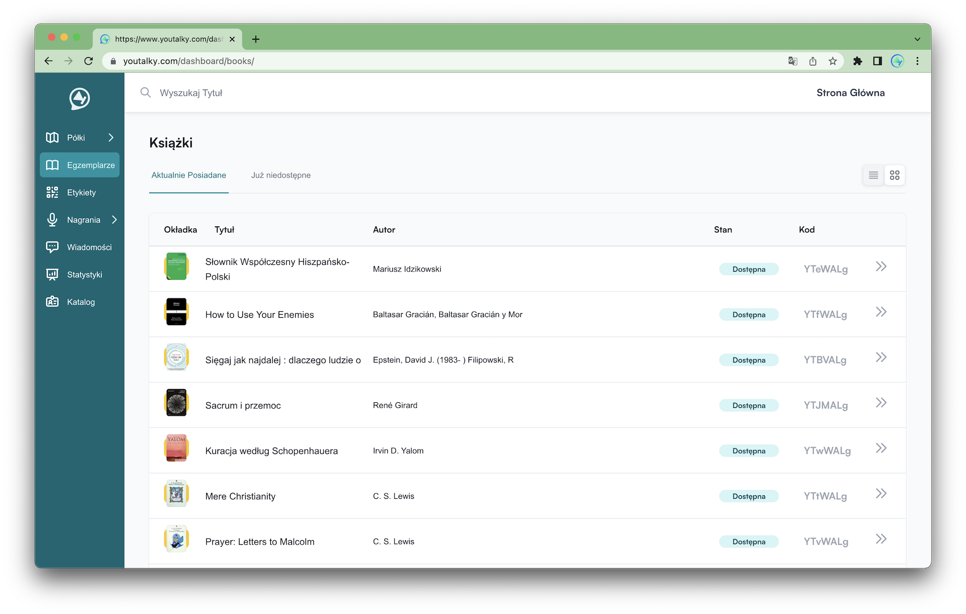 Posiadane to lista wszystkich książek, których obecnie jesteśmy właścicielami. Książki mają status dostępne czyli są widoczne na publicznym profilu dostępnym dla każdego niezarejestrowanego użytkownika. Możemy w każdej chwili zmienić stan każdej książki na niedostepny.