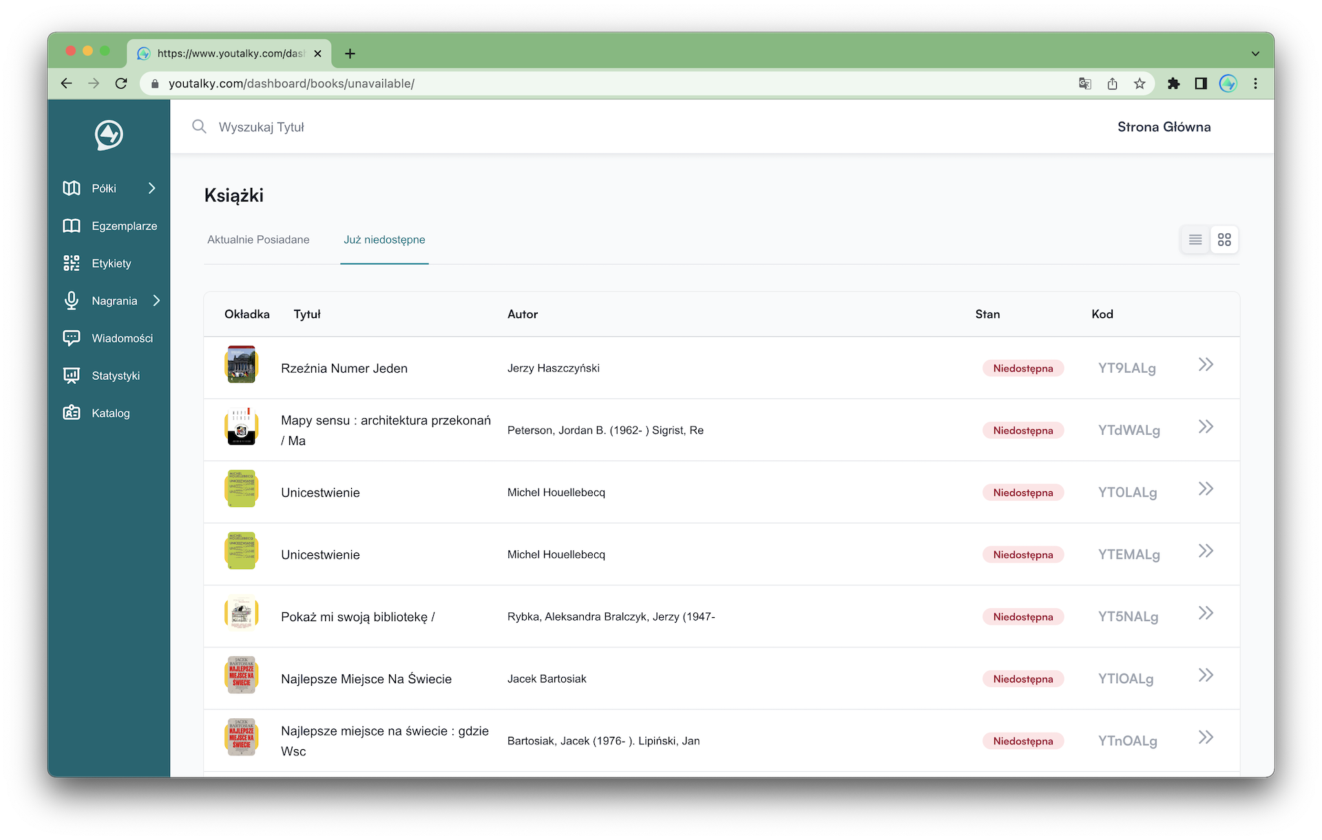 Lista wszystkich książek, których stan zmieniliśmy na niedostępne. Książki wyświetlane tutaj będą widoczne tylko dla nas, nie będą widoczne na naszym publicznym profilu.